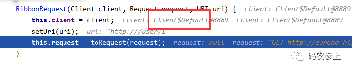 进入 RibbonRequest 的构造方法中,可以看见,用的 Client 的实现类是 Client$Default 对象,即前面讲到的在配置文件中,LoadBalancerFeignClient 中 delegate 存储的对象。