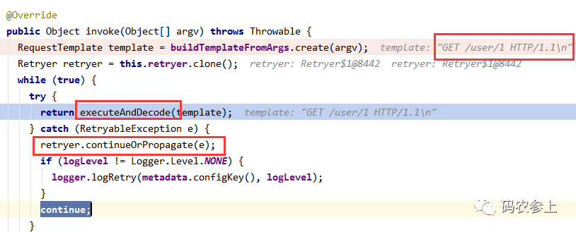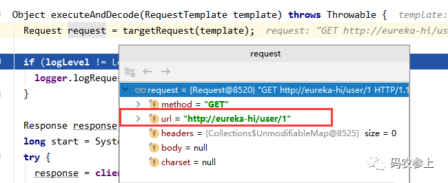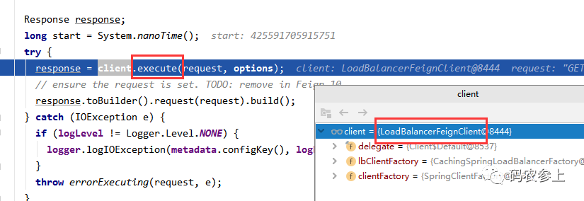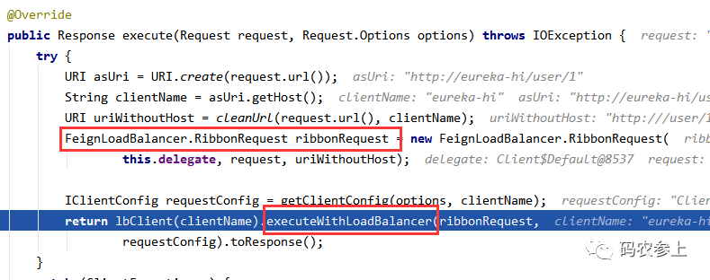 这里把请求交给了之前创建的 LoadBalancerFeignClient,执行了它的 execute 方法。和开头说的一样,和 Ribbon 类似的调用流程。只不过需要区别一下的是,Ribbon 是使用拦截器拦截请求,而 Feign 是使用动态代理的 invoke 方法对方法进行拦截并转发。
