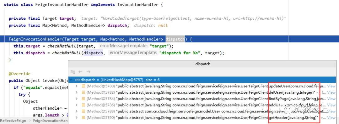 最终调用了 ReflectiveFeign 类中的 newInstance 方法。其中名为 nameToHandler 的 Map 中存储了 FeignClient 接口中定义的方法: