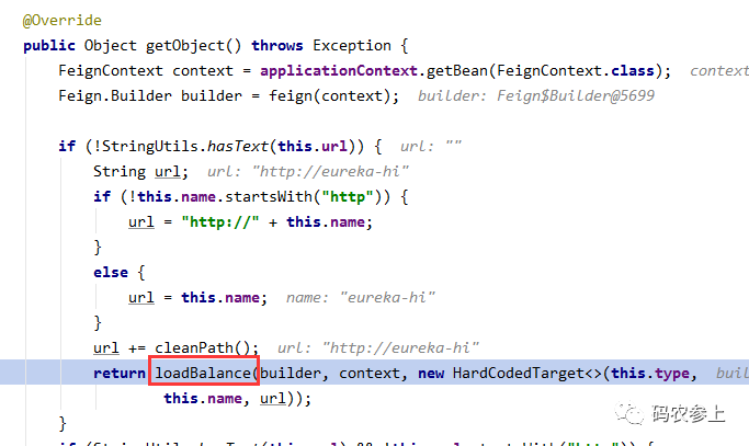 至此,已经把要创建的接口代理对象的信息放入 registry 里面,之后 spring 在启动调用 refresh 方法的时候会负责 bean 的实例化。在实例化过程中,调用 FeignClientFactoryBean 的 getObject 方法: