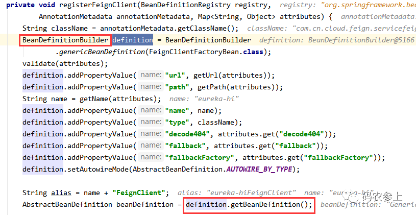注意这里通过 BeanDefinitionBuilder 创建的是一个 FeignClientFactoryBean 类型的工厂 bean,注意通过它的 getObject 返回的才是我们的 FeignClient。之后通过 BeanDefinitionBuilder 填充 FeignClient 对象的属性,并获得 BeanDefinition。