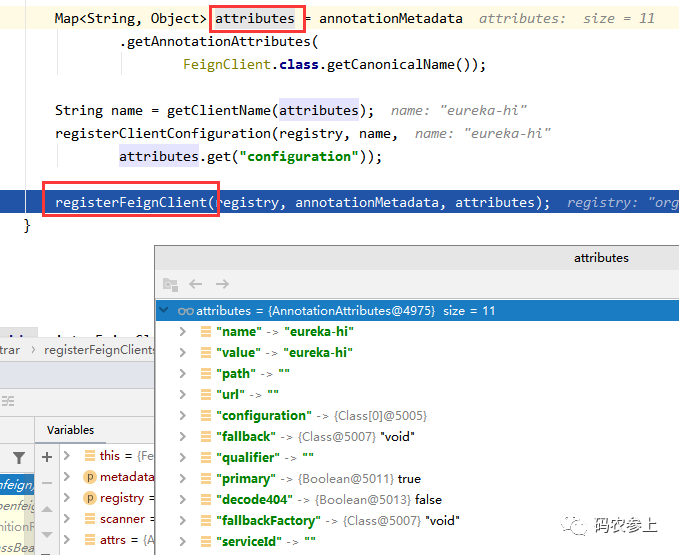 读取 @FeignClient 注解的内容,并存放在一个 Map 中,由于我在注解中只指定了 name,因此只存在 name 和 value 的值(value 通过 @AliasFor 指定为 name 的别名)