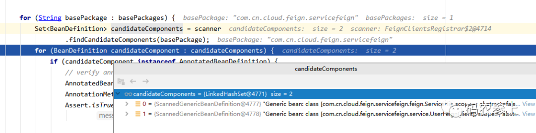 通过扫描,得到所有在 basepackage 定义的路径下的被 @FeignClient 注解标记的类的 BeanDefinition。