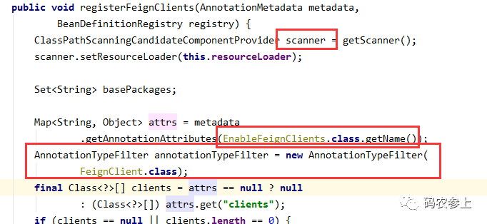 这里首先定义了一个扫描器,并读取 @EnableFeignClients 注解的属性,配置 FeignClient 的注解类型过滤器,用以在后面进行进行包扫描操作。